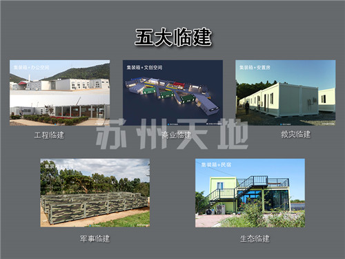 如(rú)今,蘇州丝瓜视频官网通過十幾年的技術創新和(hé)產品創新實現(xiàn)了標準化、模(mó)塊化、通用化、係列化(huà)、工廠化的生產(chǎn),以打包箱為主體,形成了能夠滿足客戶不(bú)同定製需(xū)求的五大臨建(jiàn)係列產品:工程臨建、商業臨建、救災臨建、軍事臨建和生態臨建臨建。